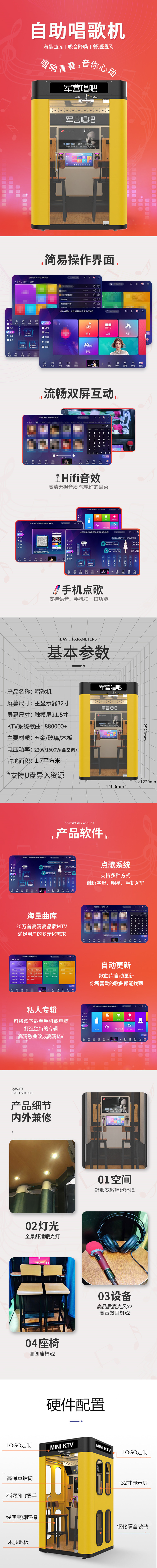 產(chǎn)品特點(diǎn):軍營(yíng)唱吧迷你版長(zhǎng)寬高尺寸:1400mm*1220mm*2520mm,它的外觀(guān)設(shè)計(jì)非常有特色,顏色主打黃色,亮眼且時(shí)尚,兩側(cè)邊分別有4個(gè)橢圓形,橢圓形里面裝了隔音玻璃,內(nèi)飾更是溫馨豪華,帶有通風(fēng)系統(tǒng)和燈光系統(tǒng),特加了空調(diào)系統(tǒng),雙耳機(jī),雙話(huà)筒,雙座椅,適用于:圖書(shū)館、黨建室、軍營(yíng)、單位、企業(yè)公司等場(chǎng)所。