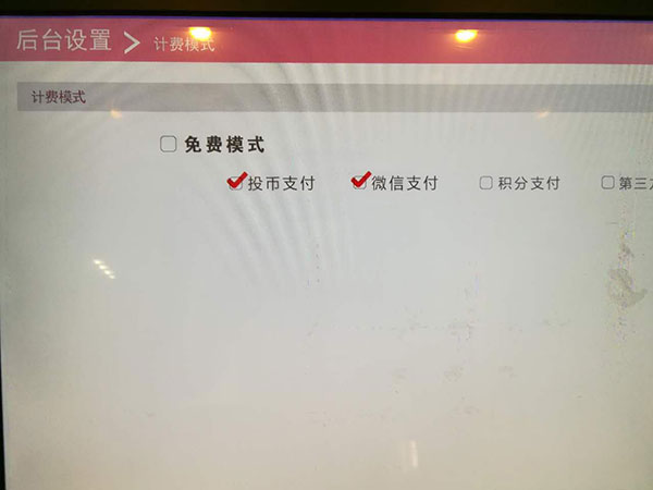 1.在后臺(tái)設(shè)置收費(fèi)模式,勾選“投幣支付”