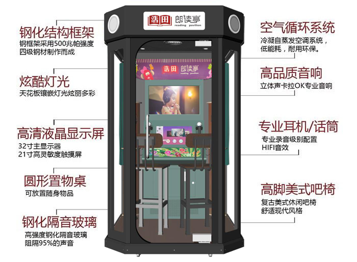 7.唱歌朗讀亭:全國首創(chuàng)豪華版唱歌+朗讀二合一的朗讀亭??勺杂汕袚Q朗讀模式和唱歌模式,朗讀可設置成免費,唱歌可設置為多少元一首或者多少元多少分鐘。