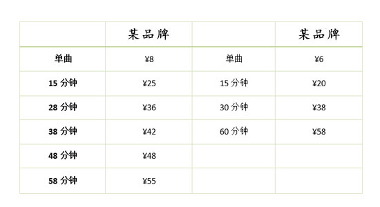 北京地區(qū)部分單曲收費8元,15分鐘收費20元、30分鐘38元、60分鐘58元。也有單曲收費為8元,分時段收費15分鐘為25元、28分鐘36元、38分鐘42元、48分鐘48元、58分鐘55元。