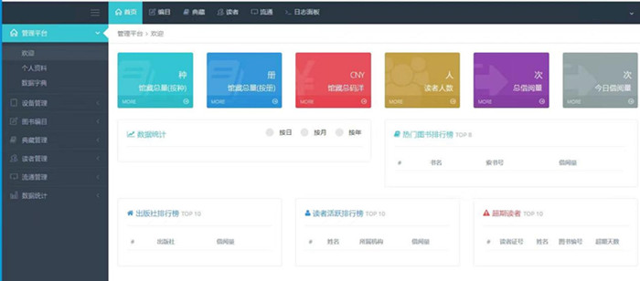 數(shù)據(jù)統(tǒng)計(jì):支持顯示當(dāng)日書刊借閱統(tǒng)計(jì)、當(dāng)日?qǐng)D書流通統(tǒng)計(jì)、熱門圖書排行統(tǒng)計(jì)、圖書分類數(shù)量統(tǒng)計(jì)、月借書量統(tǒng)計(jì)、圖書借閱趨勢(shì)統(tǒng)計(jì)、圖書分類數(shù)量統(tǒng)計(jì)、按月分類借閱偏好統(tǒng)計(jì)、圖書狀態(tài)統(tǒng)計(jì)等功能;