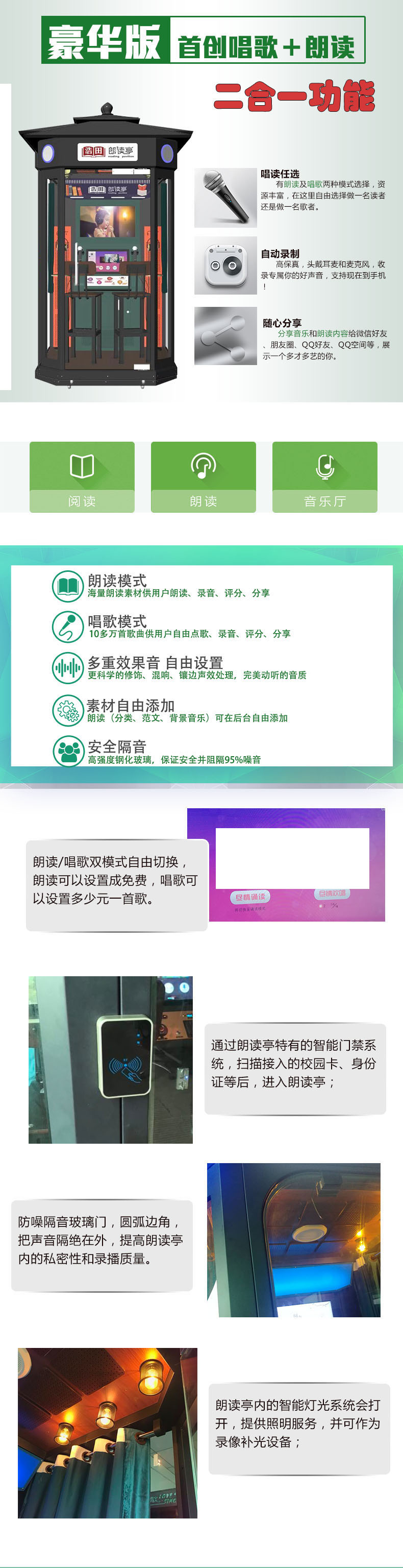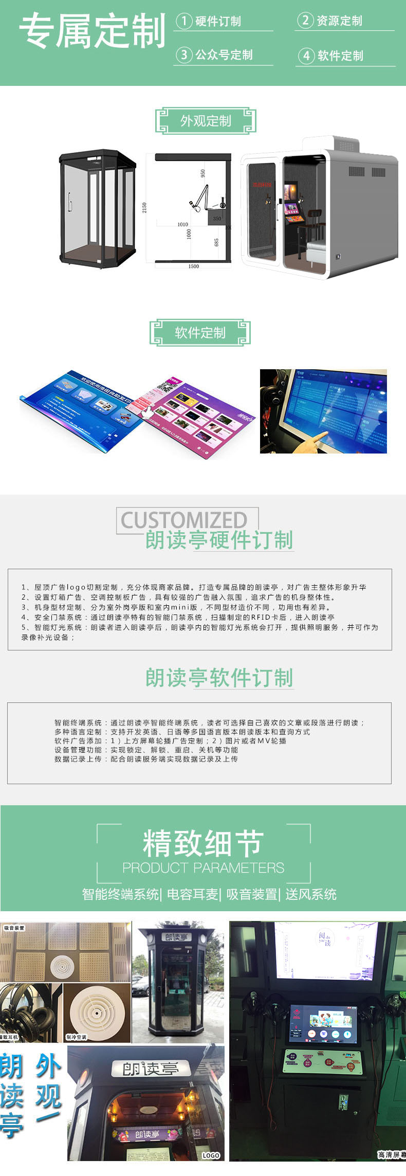 一:語音朗讀亭集成了專業(yè)的音頻設(shè)備、照明系統(tǒng)、隔音系統(tǒng)等,讓您在絢麗的燈光和背景音樂的渲染下,盡情地在文字中放飛想象,在朗讀中感悟人生。